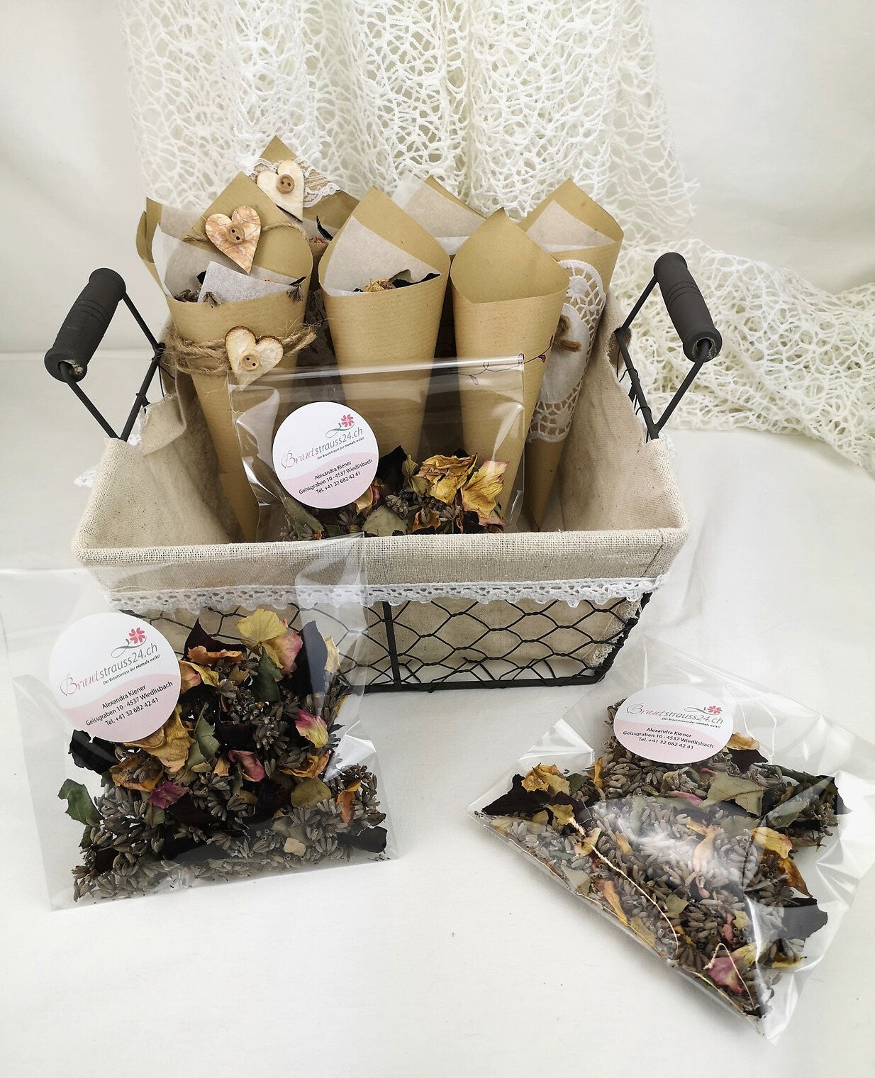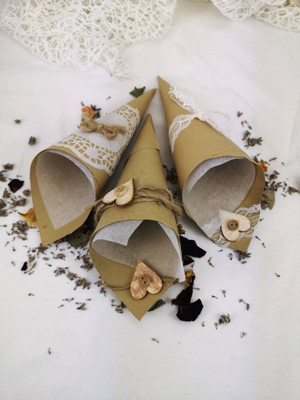 Süsse Papiertütchen für Blütenkonfetti. Da die Tütchen von Hand gemacht werden können sie im Design etwas variieren. 3- fach assortiert. 12 Stück pro Verpackungseinheit. Die Tütchen werden fertig zusammengestellt geliefert.