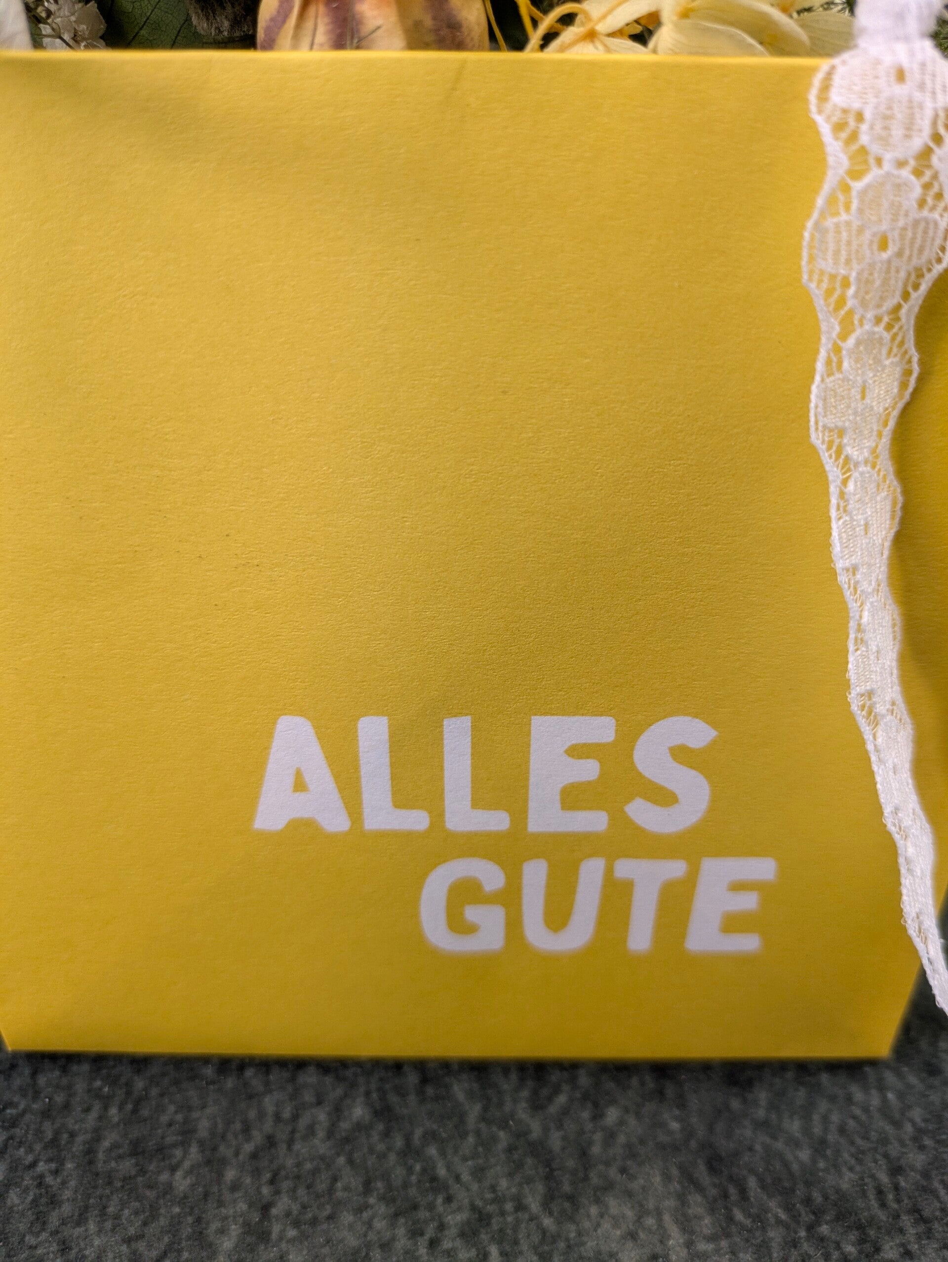 Mit gelber Papiertasche "Alles Gute" gefüllt mit kleiner gelber Sonnenblume, Lavendel, Chrysantheme diversen Gräser und kleinen Blüten.