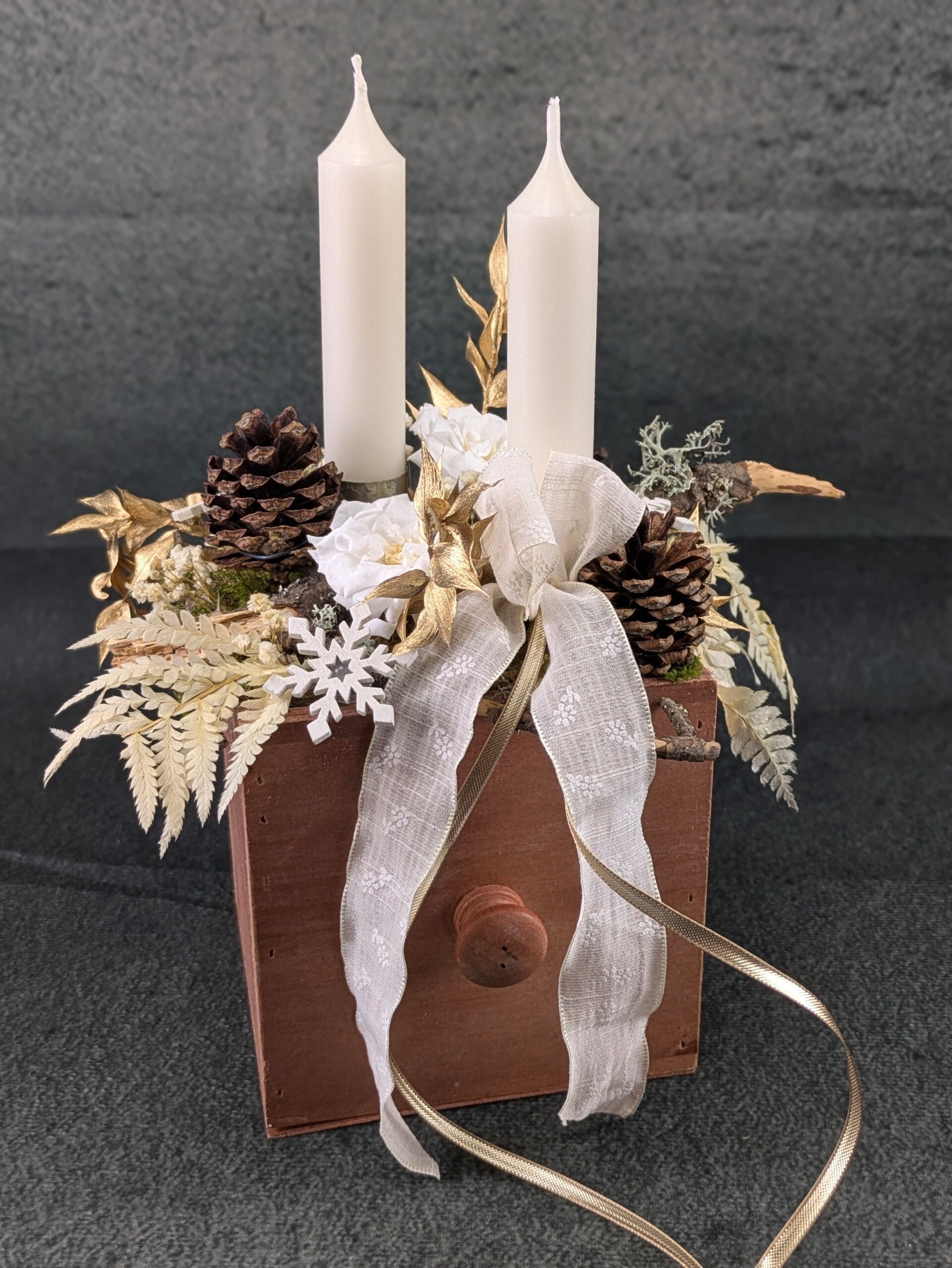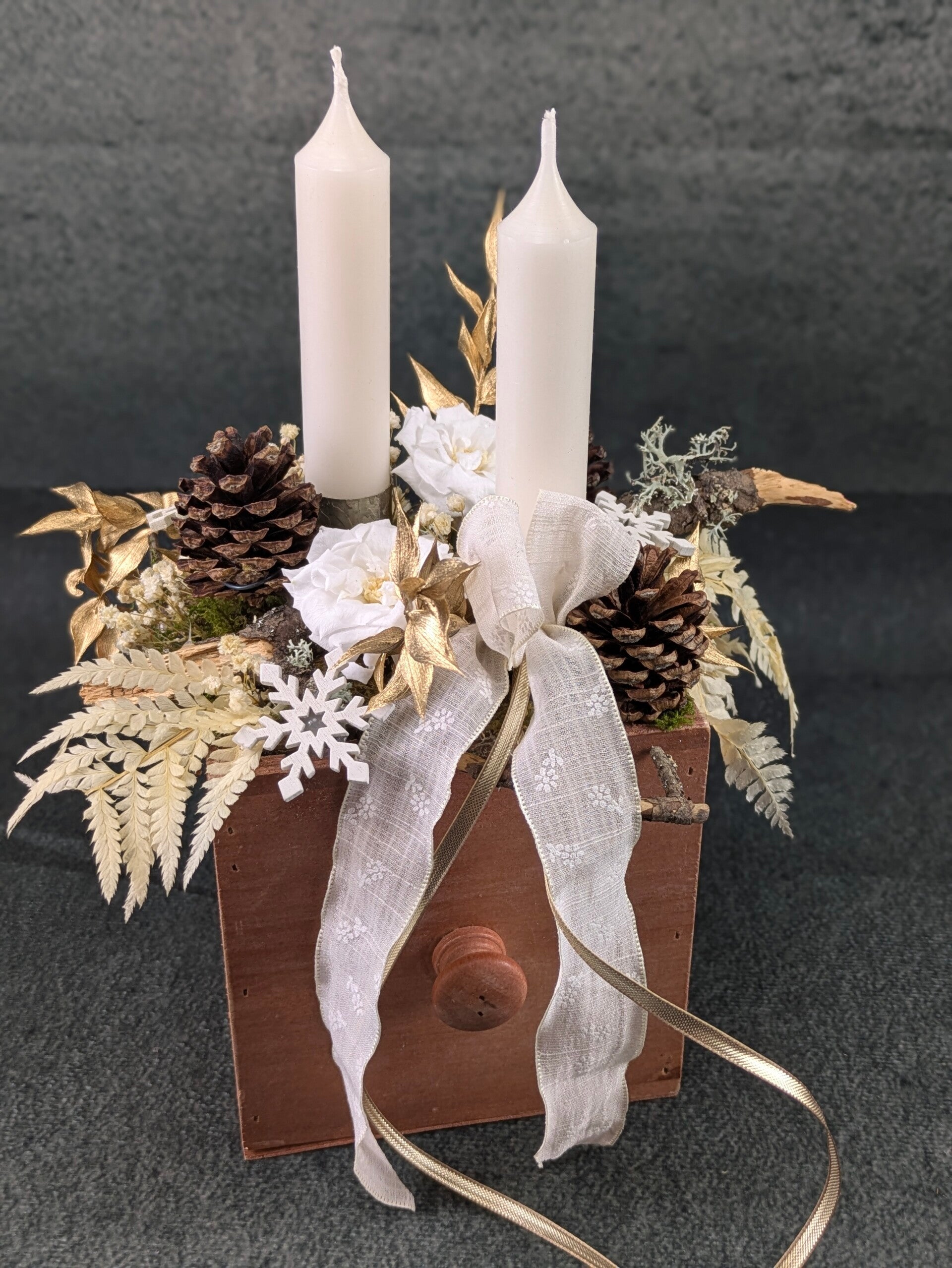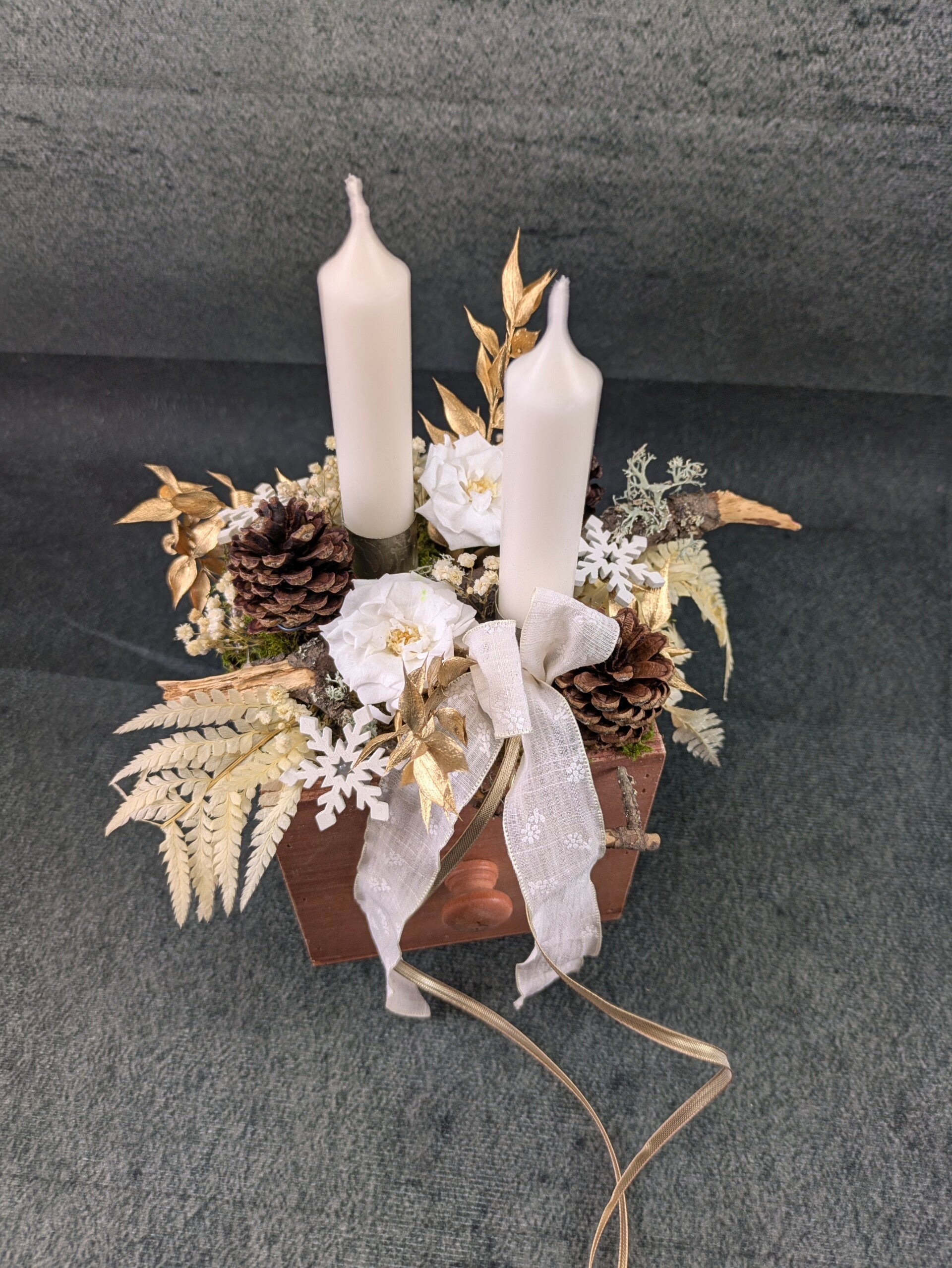 Ein liebevoll gefertigtes Unikat, das dank der haltbaren, stabilisierten Blüten über viele Saisons hinweg Freude schenkt – perfekt als Tischdekoration, Geschenk oder stilvoller Akzent in der Adventszeit.