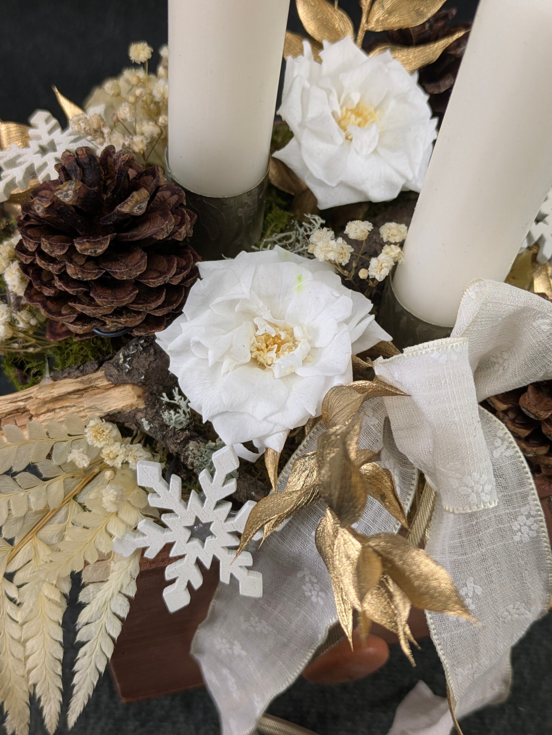 Ein zauberhaftes Wintergesteck, das natürliche Eleganz und festliche Stimmung vereint. In einer rustikalen Holzbox arrangiert, treffen zarte, stabilisierte Blüten auf Tannenzapfen, goldene Akzente und feine Naturmaterialien.