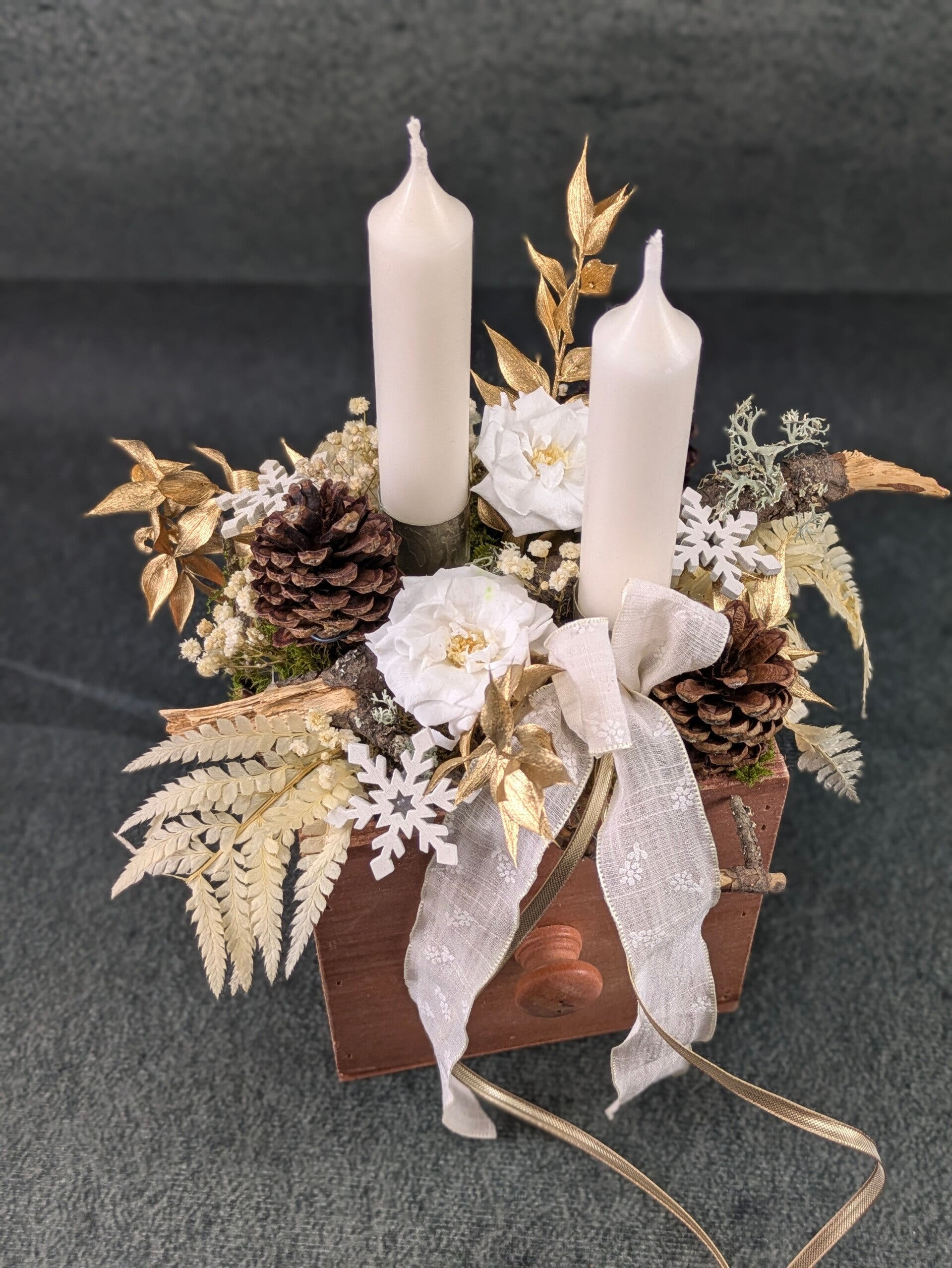 Winterliches Kerzengesteck mit stabilisierten Blüten