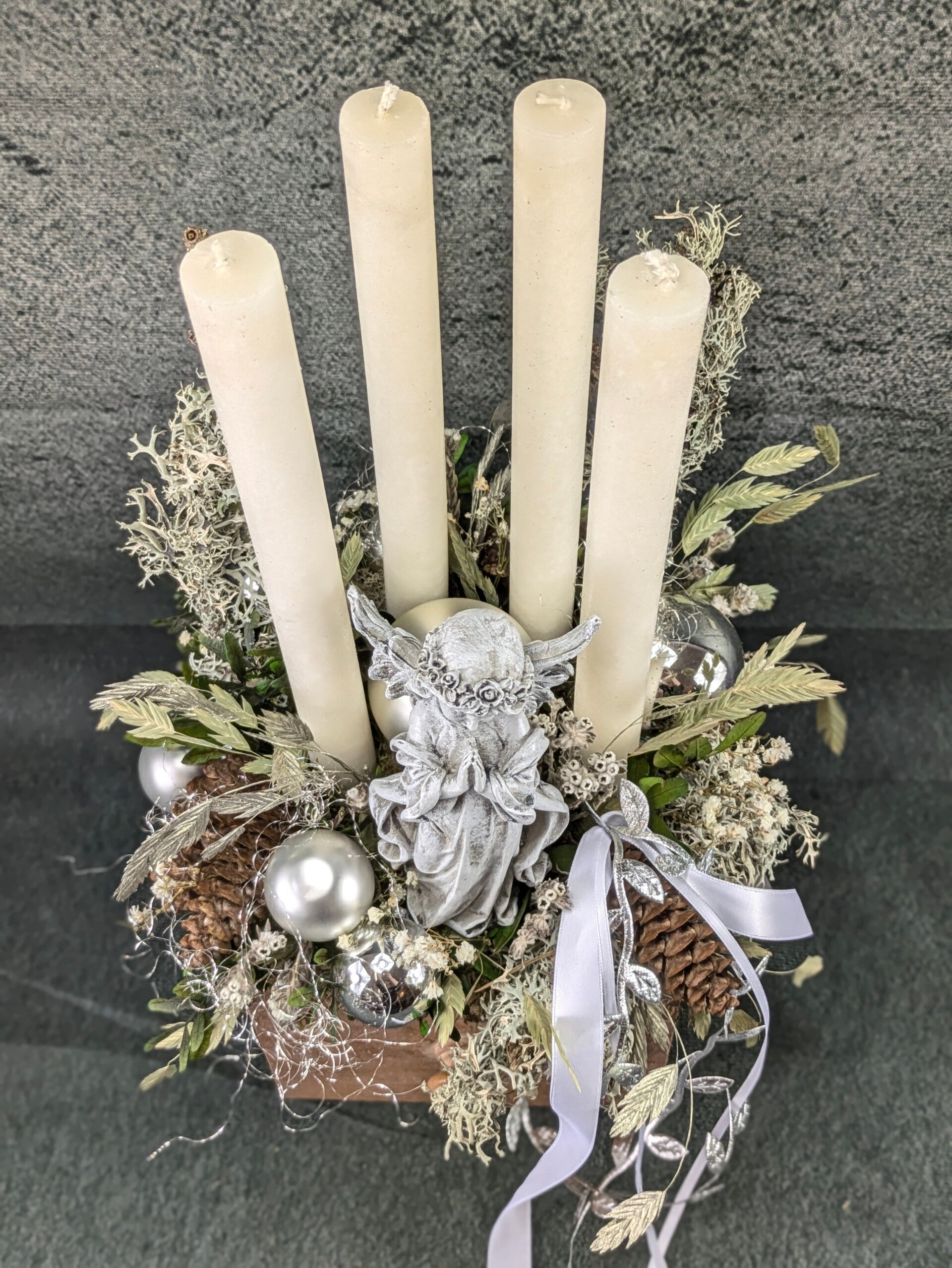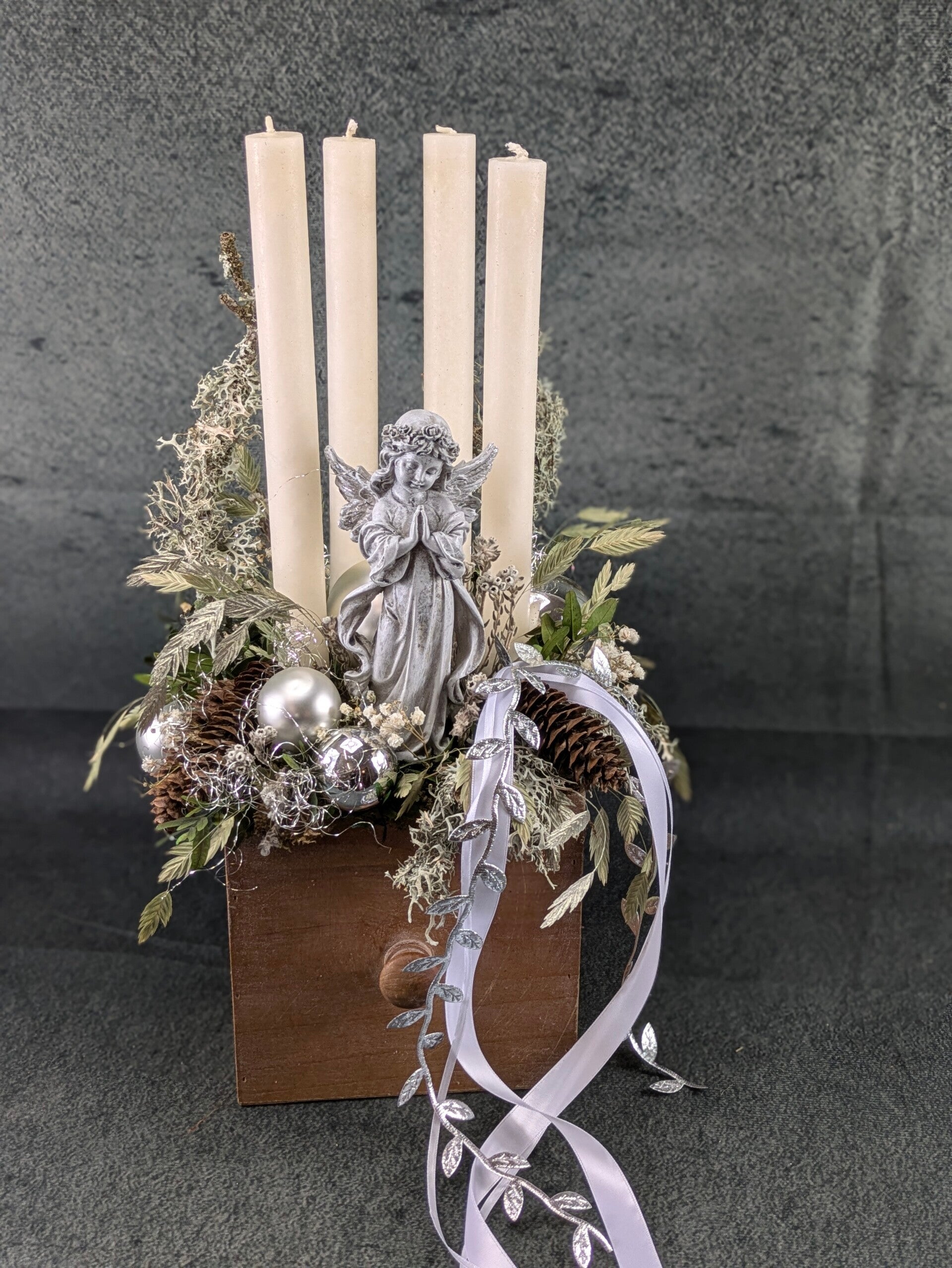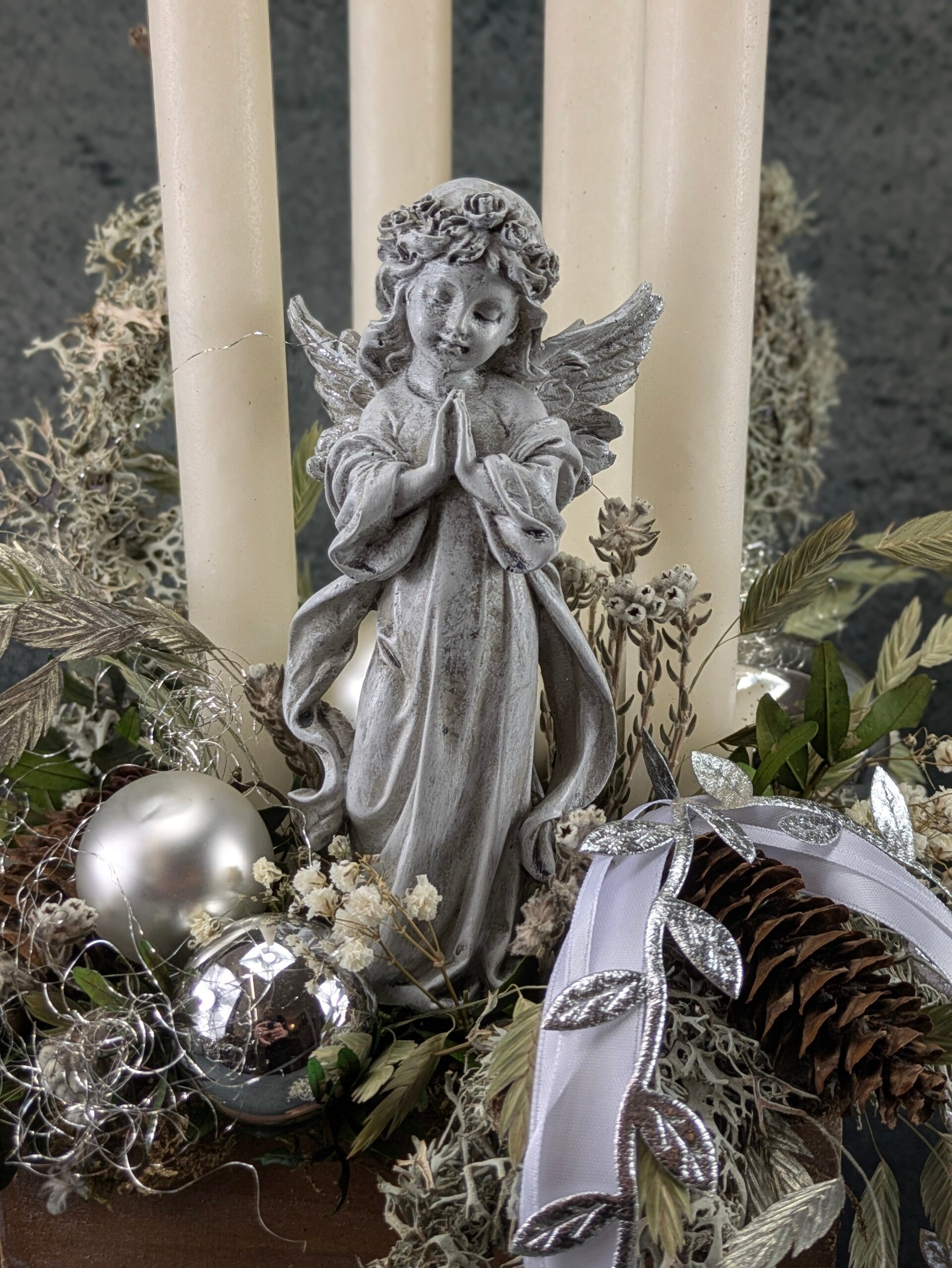 Im Mittelpunkt steht eine detailreiche Engelsfigur, die von vier eleganten Stabkerzen umrahmt wird. Zarte Trockenblumen, silberne Kugeln, Tannenzapfen und filigrane winterliche Zweige verleihen dem Arrangement einen festlichen, leicht romantischen Charakter. Eine hochwertige Schleife mit silbernen Blättern rundet die Komposition stilvoll ab.