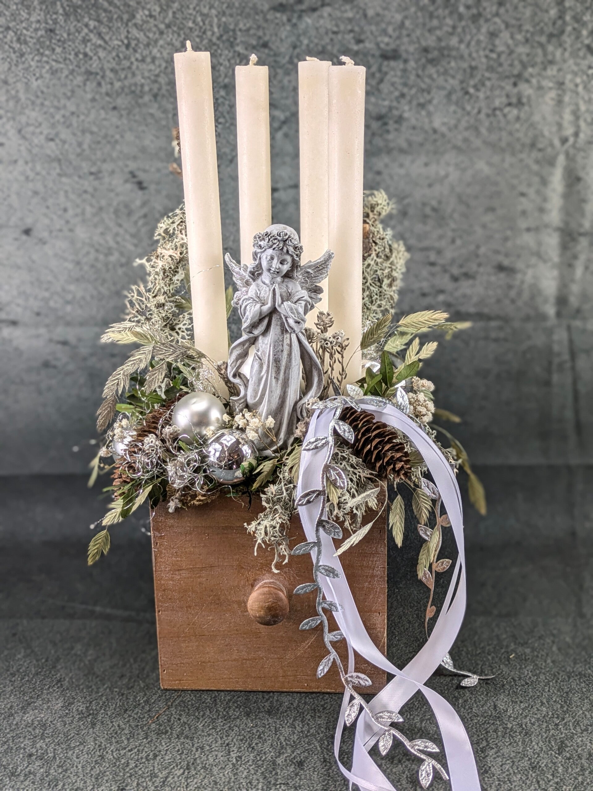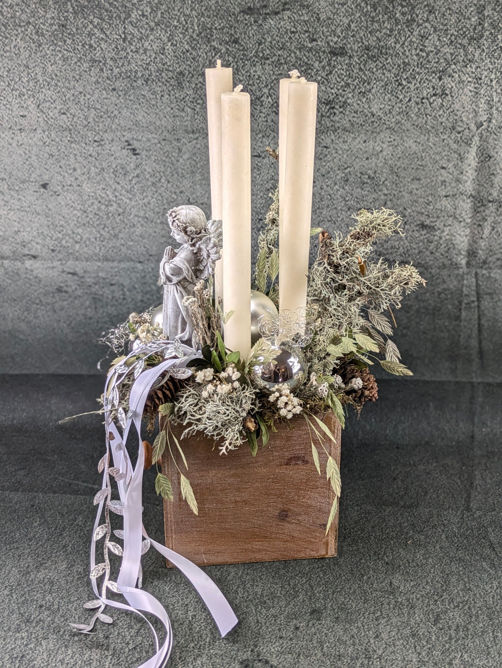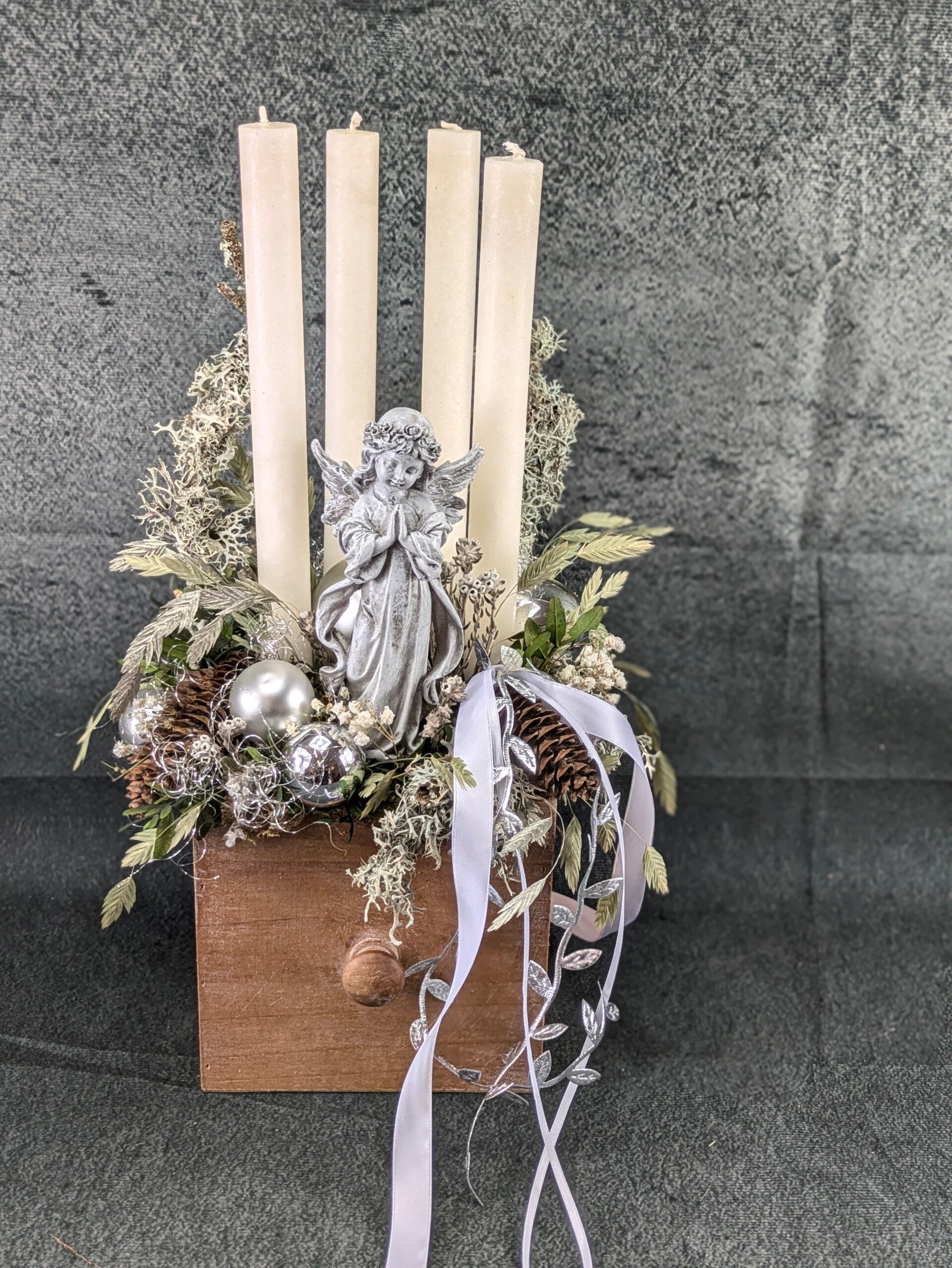 Im Mittelpunkt steht eine detailreiche Engelsfigur, die von vier eleganten Stabkerzen umrahmt wird. Zarte Trockenblumen, silberne Kugeln, Tannenzapfen und filigrane winterliche Zweige verleihen dem Arrangement einen festlichen, leicht romantischen Charakter. Eine hochwertige Schleife mit silbernen Blättern rundet die Komposition stilvoll ab.