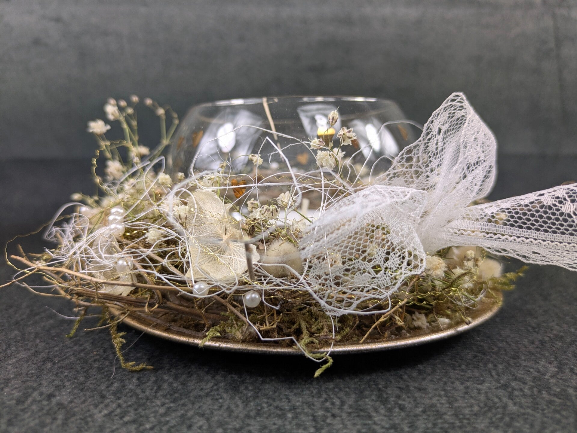 Dieser liebevoll gestaltete Windlichtgesteck vereint natürliche Materialien mit feinen Details und warmem Kerzenlicht. Das süsse rund Glas, dezent verziert mit kleinen Herzen als Symbol für Liebe und Verbundenheit und mit Teelicht, sitzt auf einem Kranz mit getrockneten Naturmaterialien, zarten Blüten und Moos und feinen Akzenten in Weiss und Gold, dezent verziert mit kleinen Herzen als Symbol für Liebe und Verbundenheit. Jedes Stück wirkt harmonisch, ruhig und einzigartig – perfekt als dekorativer Blickfang oder als besonderes Geschenk.